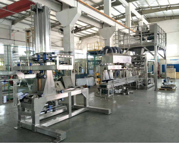 Il sistema si applica alla pesatura automatica quantitativa, riempiendo, impastando ed accumulandosi pesi e periodi, cucendo/sigillamento termico e trasportando con l'assistente manuale per il materiale della polvere nella fabbrica della farina o il materiale quale forma della pallina.