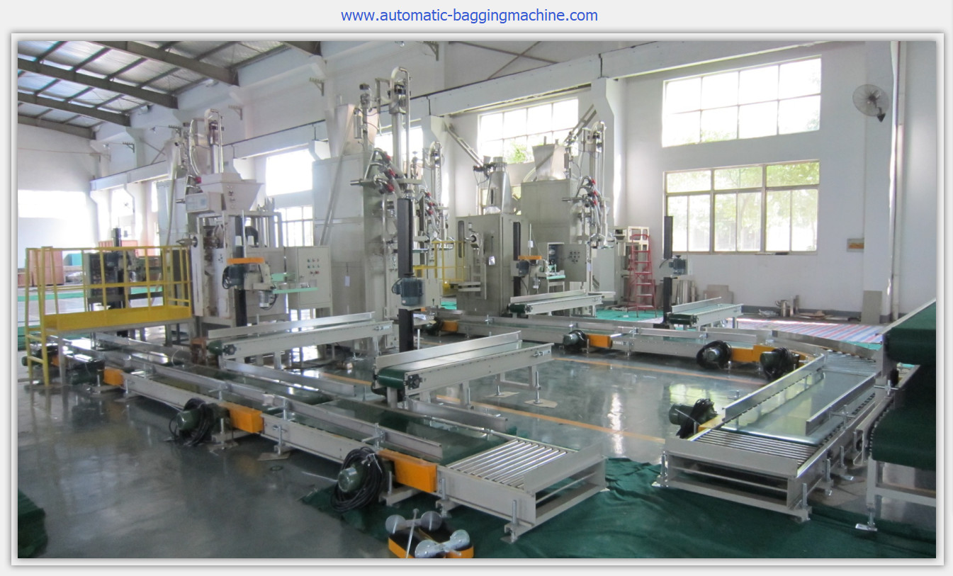 La latta trasformata la linea con i trasportatori, macchina per cucire, sigillatore del calore, trasportatore di trasporto con palette e dell'semi-imballaggio della borsa di caduta, rimodellante il trasportatore, controllore di peso, rifiuta il trasportatore, rivista di pallet, impilatore.