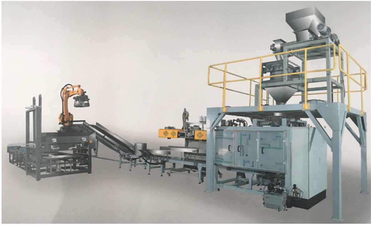 Borsa vuota dante automatica - pesatura automatica - materiale da otturazione automatico - macchina per cucire automatica - trasporto automatico - impilamento di trasporto con palette del robot automatico;